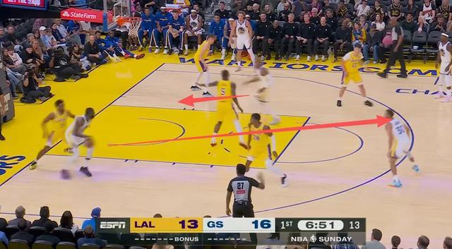 还有一个回合,勇士在场上摆出五外阵容,霍福德站在弧顶拉开空间,随后下顺带走弧顶的防守人,库里跑位接到追梦的助攻三分命中。以往追梦都是在弧顶发牌,但这个回合追梦是在底线,勇士的进攻有了更多的套路。